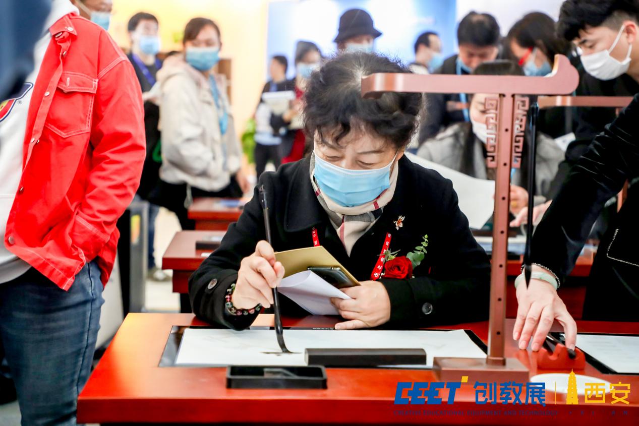 ▲陜西省教育廳教育技術裝備管理中心主任趙夢現場親身感受華文眾合智慧書法教室