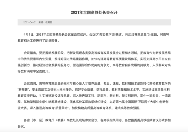 近日,2021年全國高教處長會在陜西西安召開。教育部高教司吳巖司長做了《夯實教學“新基建” 托起培養高質量》主題報告,為如何構建高等教育高質量發展體系、建成高等教育強國指明了方向。