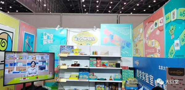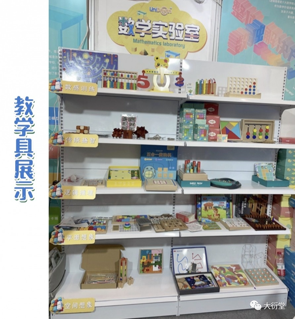 在本次大衍堂展位中,我們搭建展出了創(chuàng)新數(shù)學教育研發(fā)設計的教學產(chǎn)品和服務。從“數(shù)學實驗室”場景的文化墻設計、空間營造、掛圖和模型展示,到沙盤桌等硬件教具設施,并將課程配套學具以數(shù)學價值進行分類展示。