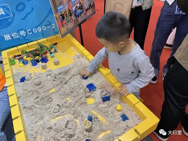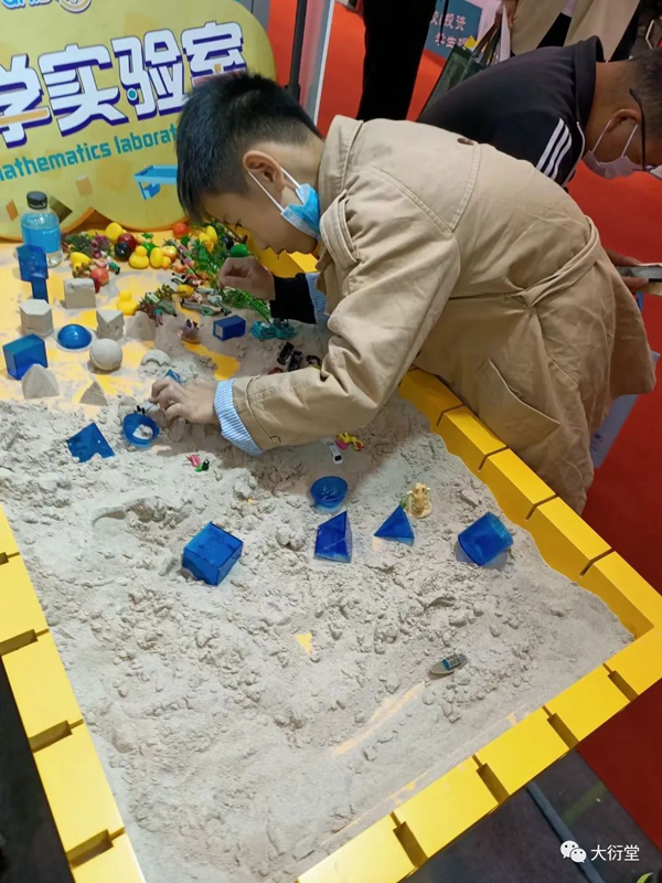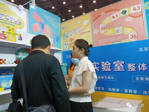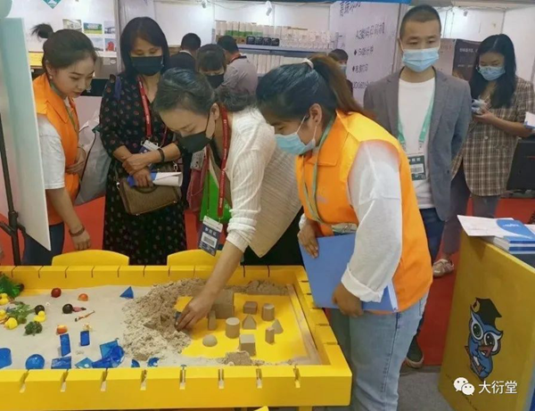 現(xiàn)場的小伙伴為參展人員耐心詳細地講解大衍堂的數(shù)學實驗理念與綜合實踐解決方案,例如,以大衍堂首創(chuàng)、獨立研發(fā)的核心教具數(shù)學實驗沙盤桌,通過沙盤提供一種數(shù)學教學方式,將抽象的問題具象化、復雜的問題簡單化,在沙盤中搭建模型,建立場景,用可視化教學為廣大教育工作者解決實際問題。