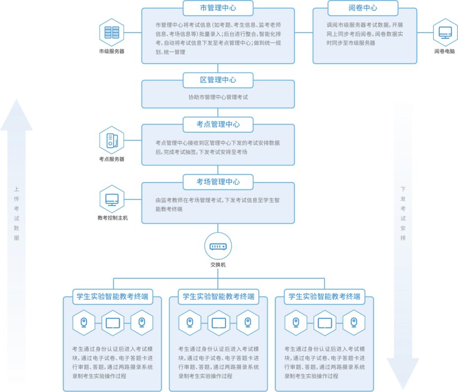 實驗操作信息化考核建設架構采用嚴格符合市-區(縣)-考點學校-考場管理體系進行建設,由市級管理中心統一發起考試計劃、考場接受指令進行現場考試環節和完成考試保障工作、考試結束后進行集中網上統一閱卷和公布成績及成績查詢組成。系統架構如下: