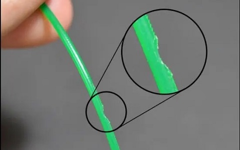 、僭跈C器平臺上出現許多“頭皮屑”,以及會發出“噠噠噠”的刨料聲,這是許多堵頭問題前都會發生的刨料聲,擠出機送料量與出絲量是一致的,但出絲量變少甚至沒法出絲時,擠出機仍會繼續按設計速度送料,由于沒法順利送出,則導致擠出齒輪不停地刨料,在耗材絲上刨出一個凹陷,產生碎屑,最終導致齒輪失去推送著力點,沒法送料。