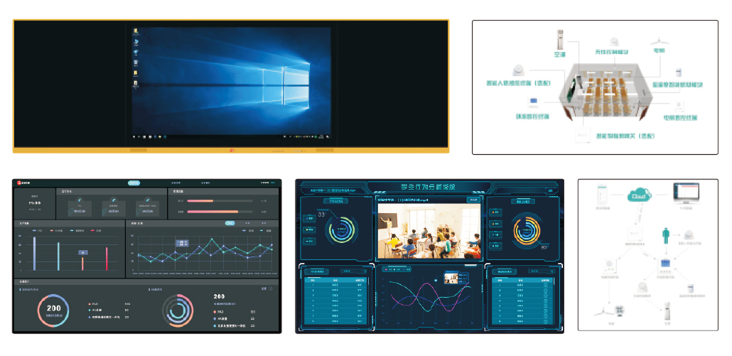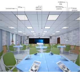智慧空氣環境質量控制系統 :主要由CO2智能感知模塊、 PM2.5/PM10智能感知模塊、智能柜式新風系統、環境智 控終端等組成,系統全方位解決教室內環境的空氣質量諸 多問題,保證教室內的空氣質量。