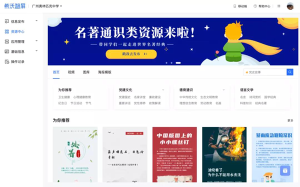 學校只需通過希沃云屏后臺的資源中心,輕松調用通識課程資源、一鍵即時發布。學生可在云屏上隨時觀看學習。這很好地為學生打開觀察世界的窗口,主動積極去認識、探索世界,豐富和強大學生的內心,培養健全人格和良好品德。