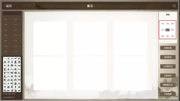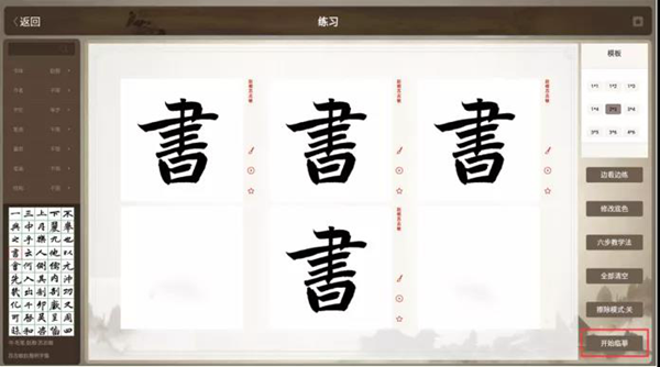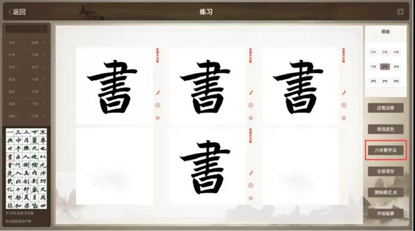 (4)選擇例字,點(diǎn)擊放置單字在模板中,依次排版或點(diǎn)擊“六步教學(xué)法”自動(dòng)排版。