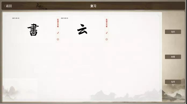 選擇“復(fù)習(xí)”欄目,可查看已經(jīng)學(xué)習(xí)過(guò)的字,“當(dāng)天”、“本周”、“當(dāng)月”按時(shí)間記錄學(xué)習(xí)過(guò)的內(nèi)容。