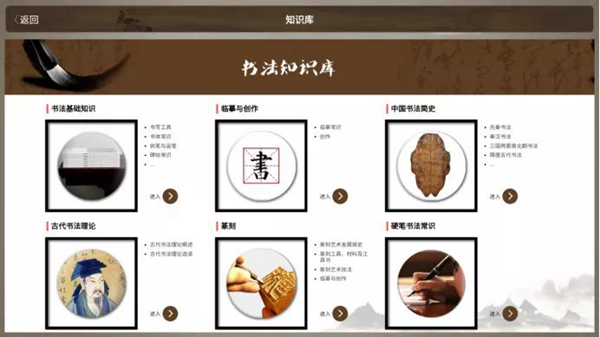 選擇“知識(shí)庫(kù)”欄目,進(jìn)入知識(shí)庫(kù)學(xué)習(xí)書(shū)法常識(shí),包括書(shū)法基礎(chǔ)知識(shí)、臨摹與創(chuàng)作、中國(guó)書(shū)法筒史、古代書(shū)法理倫、篆刻、硬筆書(shū)法常識(shí)等。