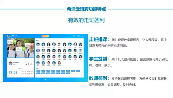 希沃云班牌不僅能夠展示校園文化,還能夠解決新高考政策后高中學(xué)校面臨的走班排課等教學(xué)管理問題。通過希沃云班牌,師生可實(shí)現(xiàn)刷臉或佩戴不同的智能配件刷卡簽到,即使在不同班級(jí)也能登錄個(gè)人頁面,查看選課內(nèi)容、課程安排與出勤情況等信息。希沃云班牌還能幫助學(xué)校精準(zhǔn)掌握學(xué)生學(xué)習(xí)情況,對(duì)走班條件下的學(xué)校考勤、信息發(fā)布查詢、教學(xué)管理等實(shí)行更加全面的信息化管理。