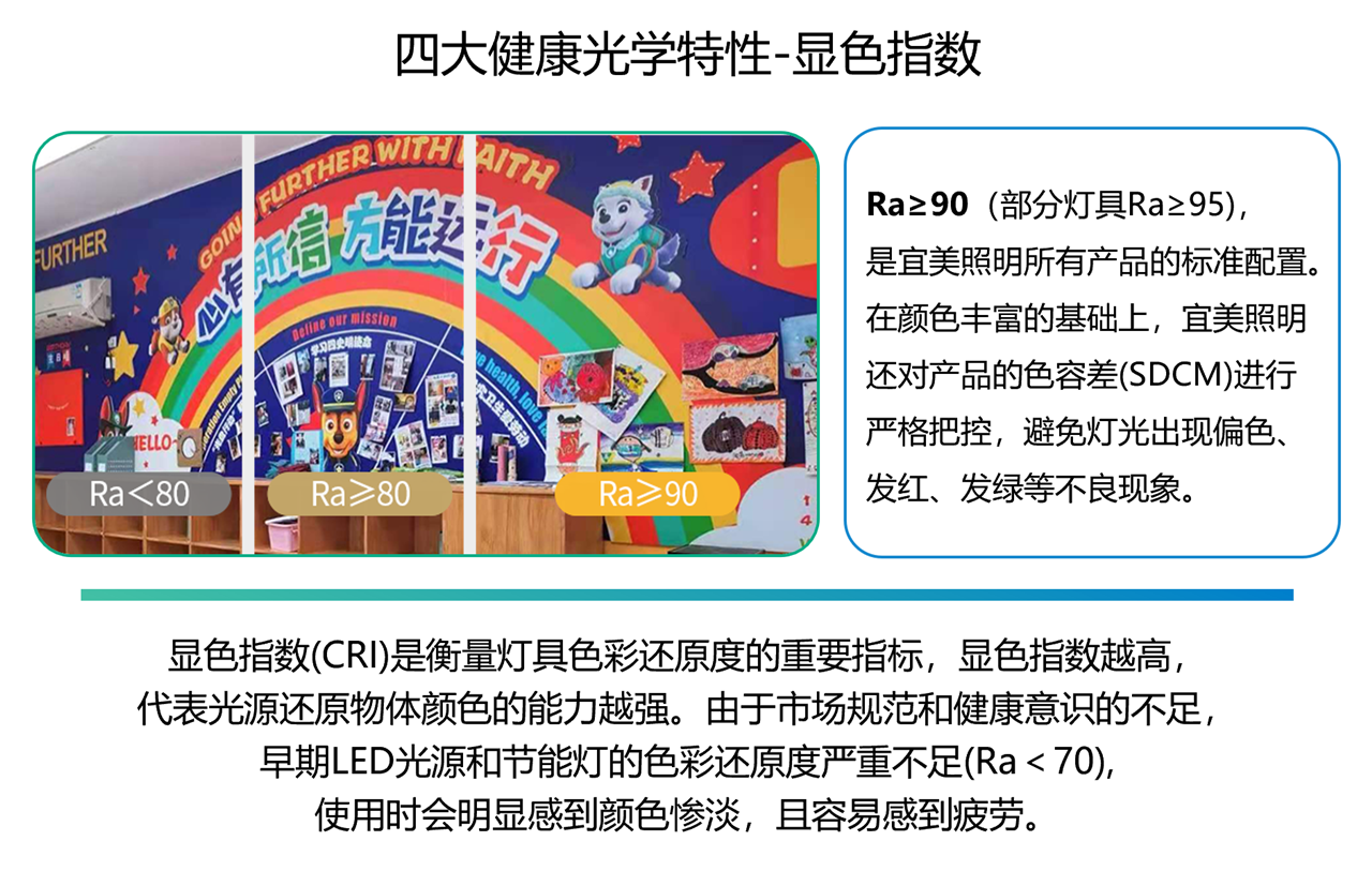 青少年的健康成長是一個嚴肅的話題,卓越的品質也是宜美照明不容妥協的追求。自宜美照明進駐國內市場以來,所有的燈具產品便具備了“4+2”,品質“4+2”是宜美照明獨創的品質理念,其中包含“高顯色性、無可視頻閃、防眩光、無藍光、長壽命、高安全性”。為此,宜美照明的一百余位設計師和工程師不懈努力,為國內市場研發了一系列品質超前、技術領先的教育、商用和家居燈具產品。