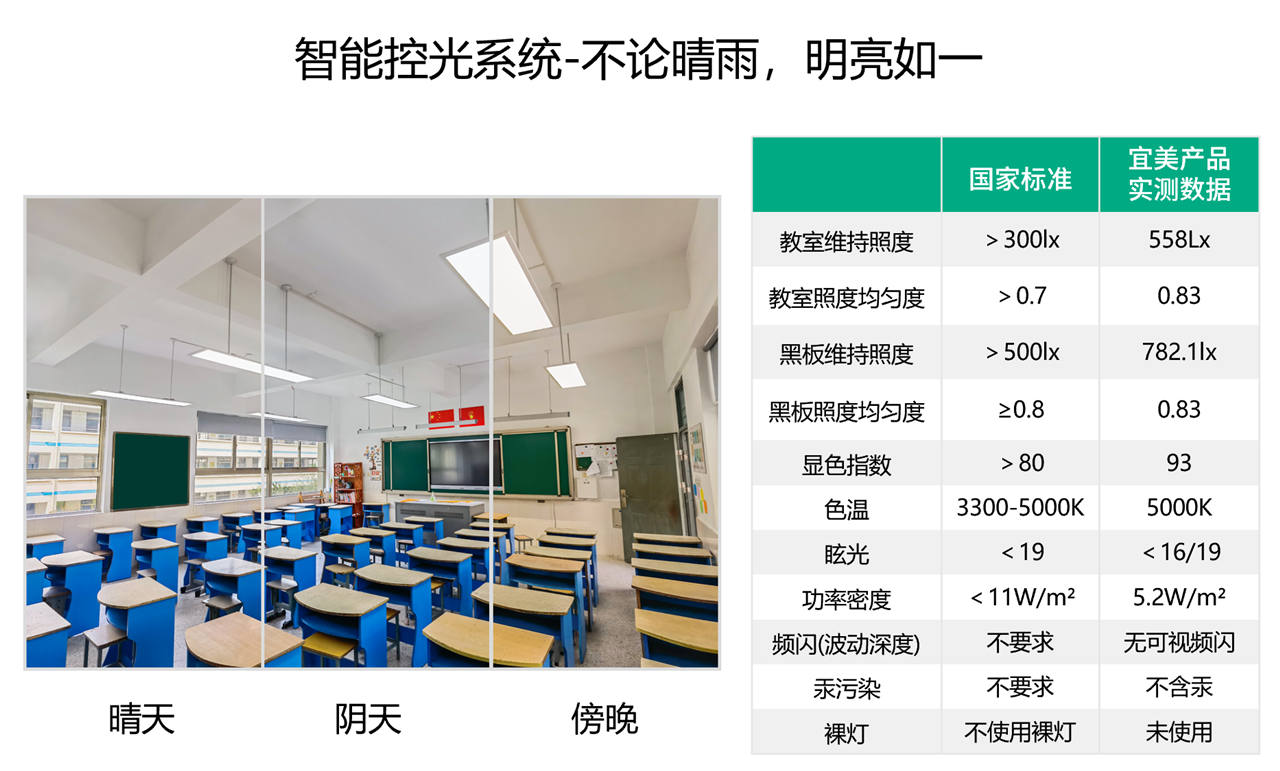 宜美照明的黑板燈和教室燈能夠通過傳感器實時感知教室內的光照條件,使得課桌和黑板的照度維持恒定,這樣既能避免亮度過低造成視覺疲勞,又能避免強光反射刺眼。