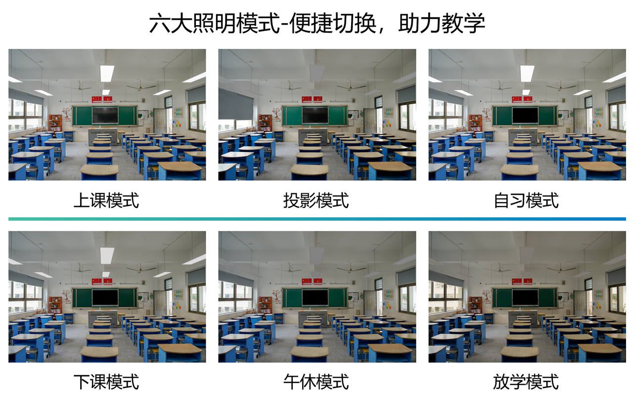除此之外,這套智能照明系統提供了6種布光模式,在上課模式下重點照亮黑板和課桌,幫助影學生幾種注意力;在投影模式下,黑板燈會通過降低亮度避免幕布眩光;在下課和放學模式下,照明系統會降低全局亮度,營造適合休息的輕松氛圍,同時避免無謂的能源消耗。