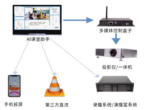 支持手機投屏,便于隨時投放課件;支持觀看錄播系統,對接演播系統、錄播系統的直播信號,輕松實現校園電視臺;支持觀看第三方流媒體,無縫對接各種原有的視頻攝像器材、可利舊、不浪費。