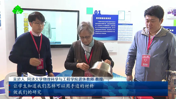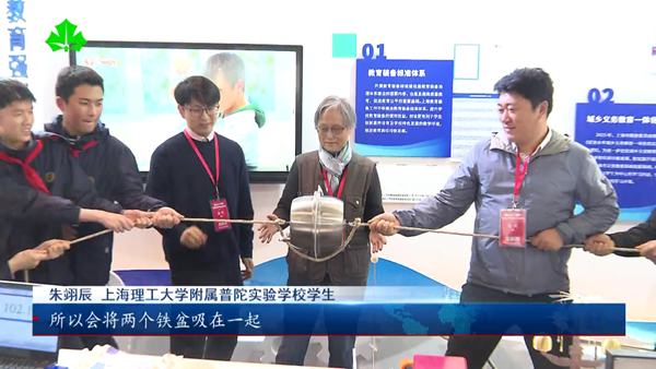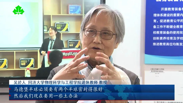 在博覽會現場,“不刷題的吳姥姥”吳於人和團隊通過自制的教具,讓同學們現場參與到“馬德堡半球實驗”中。