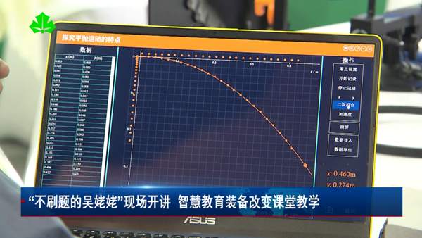 隨著小球劃出一道拋物線,一條拋物線軌跡也出現在屏幕上,坐標、初始速度、加速度等數據準確的記錄了下來。展臺負責人告訴記者,現在的數字化試驗系統已經在上海已經比較普及,涵蓋了物理、化學、生物學科大部分的實驗。