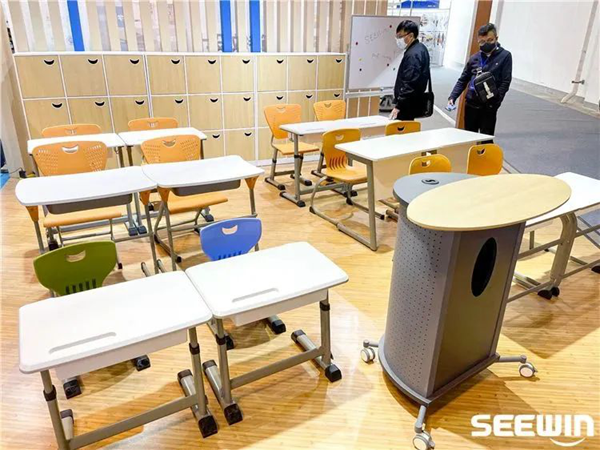 SEEWIN詩敏現場采用多套課桌椅共同打造標準教室空間,其中以格瑞課桌椅為主推新品,采用了大號小號搭配展出,實現國標高度全覆蓋,參觀者可以親身操作課桌椅,體驗環保健康的選材,用實際的產品向參觀者傳遞出我們選材用料的安全性。