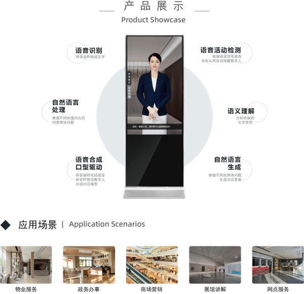 通過構建智能交互場景覆蓋全流程的人臉識別、聲音活動監測、語音識別、語義理解、文本生成,語音合成、口型驅動等人工智能自主研發能力,面向各行各業,打造高仿真、人格化、個性化的“數字員工”,利用效率提升、增進創新、數據驅動等多重優勢,為客戶創造核心價值。