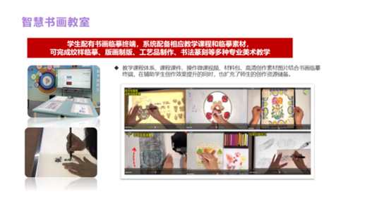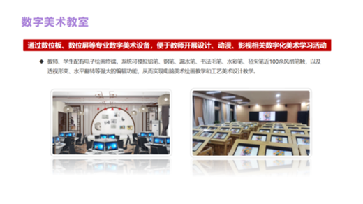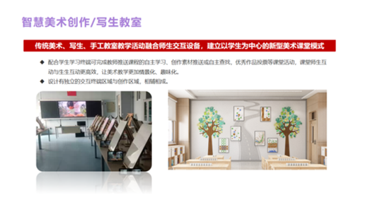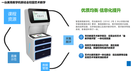 公司研發的智慧美育裝備產品結合國家政策與各地美育教學實地應用,以藝術新課標下美育素養評價為核心,貫穿軟件、硬件、課程、美育環境建設、服務于一體的一站式美育建設解決方案。為區域及學校提供藝術類功能教室、美育課程、美育評價、美育教學監測、美育大數據、美育作品展演等相關全應用場景解決方案。