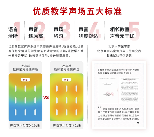 立達(dá)信在與學(xué)校多年的緊密配合中,通過深入走訪調(diào)研,了解學(xué)校教室對好聲音的需求,總結(jié)出優(yōu)質(zhì)教學(xué)聲音的五個標(biāo)準(zhǔn):語言清晰、聲音還原度高、聲場均勻、聲音響度舒適、相鄰教室聲音無干擾。
