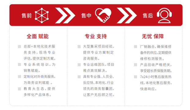服務(wù)方面,公司堅持售前全面賦能,總部+本地化技術(shù)服務(wù)支持,現(xiàn)場專業(yè)評估,提供定制方案,提供多樣化產(chǎn)品體系;售中專業(yè)支持,提供專業(yè)方案制定咨詢服務(wù);專業(yè)運維團(tuán)隊,項目難點高效解決;具有專業(yè)強、人員全、反應(yīng)快、本地化、行業(yè)領(lǐng)先的商務(wù)智囊團(tuán),讓客戶無后顧之憂;售后無憂保障,廠銷融合,確保維修備件的供應(yīng),定期提供維修檢測服務(wù);產(chǎn)品驗收嚴(yán)格把關(guān),享受超長質(zhì)保服務(wù)期;7x24小時售后服務(wù)熱線,本地化售后服務(wù),快速響應(yīng)。