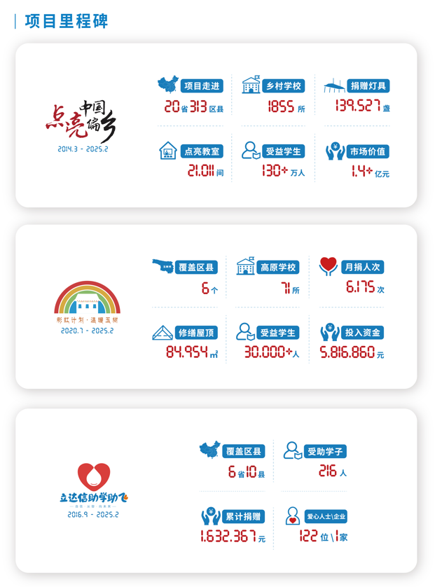基金會品牌項目“點亮中國偏鄉(xiāng)”為全國首個專注于鄉(xiāng)村學(xué)校照明改善的公益項目。該項目以立達(dá)信之所長——照明,無償捐贈護(hù)眼燈具,改善廣大中國偏鄉(xiāng)學(xué)校落后的教室照明。該項目先后獲得新浪教育“2018年度教育公益杰出項目”、國務(wù)院原扶貧辦“2020年中國社會組織扶貧案例50佳”等榮譽稱號。