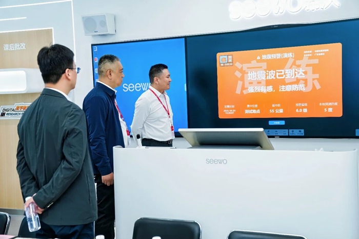 活動伊始,廣東省地震局、廣東省教育廳一行參觀了希沃展廳及“1024技術(shù)日”展區(qū),深入了解希沃在教育數(shù)字化與公共安全領(lǐng)域的技術(shù)積累與創(chuàng)新成果。據(jù)悉,希沃作為技術(shù)支持單位,研發(fā)了基于交互智能平板打造的地震預警系統(tǒng)。該系統(tǒng)通過接入廣東省地震局的預警信息,在希沃交互智能平板、智慧黑板等教學終端上以強提示方式第一時間發(fā)出預警,為師生爭取寶貴的黃金時間。