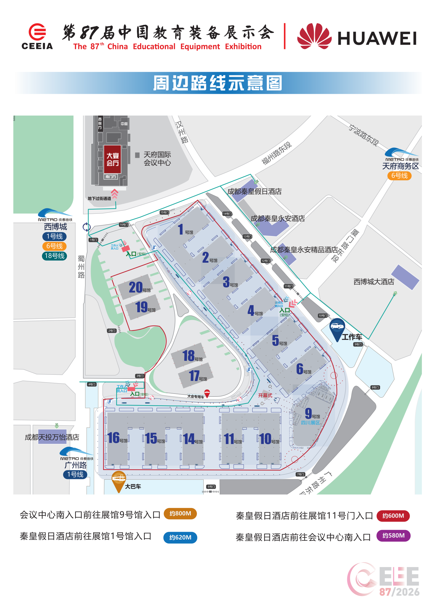 2.地鐵:天府機場地鐵站18號線→西博城站,參觀展會請從C、E口出,全程約45分鐘。