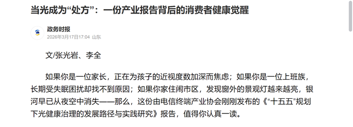 政務時報在報道中以“當光成為‘處方’”為題,精準捕捉了這一變化。文章指出,藍皮書的發布背后,是消費者健康意識的深層覺醒——人們開始追問:我每天接觸的光,對我的眼睛、睡眠、情緒究竟產生了什么影響?