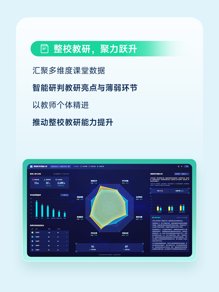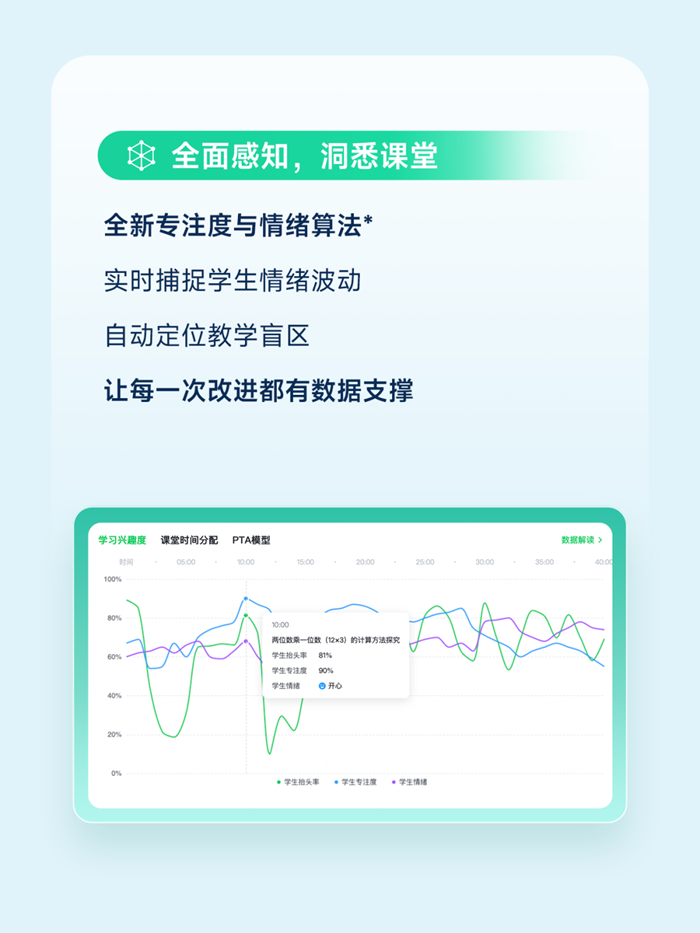 希沃課堂智能反饋系統(tǒng)核心功能契合賽事需求,通過(guò)無(wú)感采集、智能分析、數(shù)據(jù)循證,真實(shí)還原課堂全貌,幫助教師精準(zhǔn)診斷教學(xué)薄弱環(huán)節(jié),讓教研有據(jù)可循。