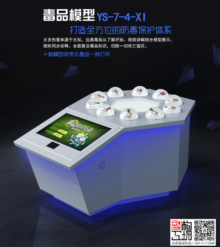 產品詳細介紹該產品包含展臺、毒品模型及觸控多媒體系統。體驗者可以在觀看毒品模型的同時,通過操作觸控界面了解其詳細知識