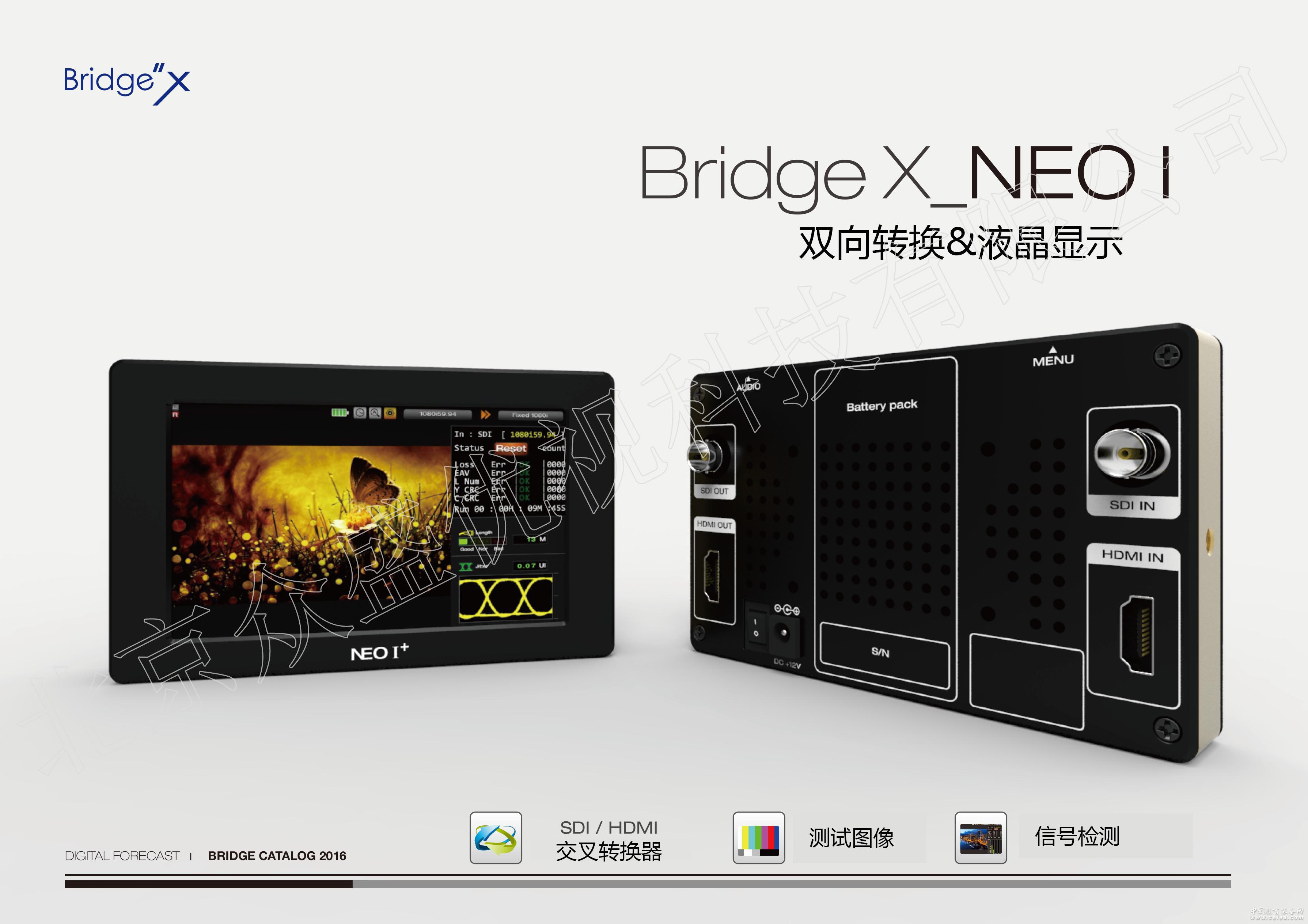 產品詳細介紹Bridge X_NEO I 支持HDMI與SDI視頻格式上下交叉轉換,具有5寸觸摸屏,可實時監測各種數據,同時支持對SDI和HDMI信號進行分析,檢查信號質量,讓視頻測量變得更容易; Bridge X_NEO I應用領域非常廣泛,可作為一個小型的監視器,也可作為便攜式信號監測儀,可監測信號源信號質量進行分析,確保輸出。