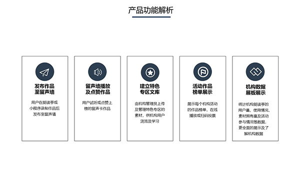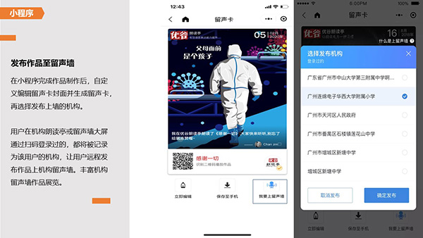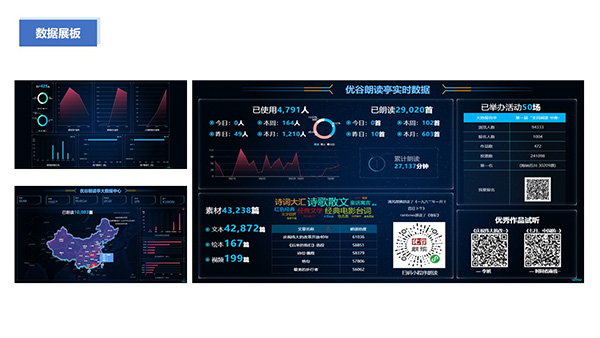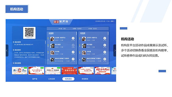 優谷留聲墻,是一款集機構用戶留聲卡作品、活動作品、黨建與疫情防護等特色資訊學習及朗讀亭使用數據的成果展示平臺,機構可自主配置內容,指引并激勵用戶朗讀練習及關注黨建等信息,用戶之間互聽互贊,提高學習積極性。