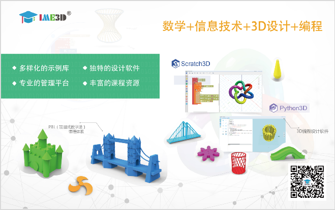 產(chǎn)品詳細(xì)介紹 該實(shí)驗(yàn)室結(jié)合圖形化編程(Scratch)和代碼編程(Python)方式,以【數(shù)學(xué)知識(shí)+信息技術(shù)+3D設(shè)計(jì)+編程】為主要切入點(diǎn),選用IME3D系列化軟件中的3D編程設(shè)計(jì)軟件Scrath3D和Python3D,及其配套的項(xiàng)目制(PBL)基礎(chǔ)和主題課程體系,將編程邏輯、3D設(shè)計(jì)和開源硬件相結(jié)合,開展編程式3D設(shè)計(jì)教育課程和各項(xiàng)活動(dòng)。