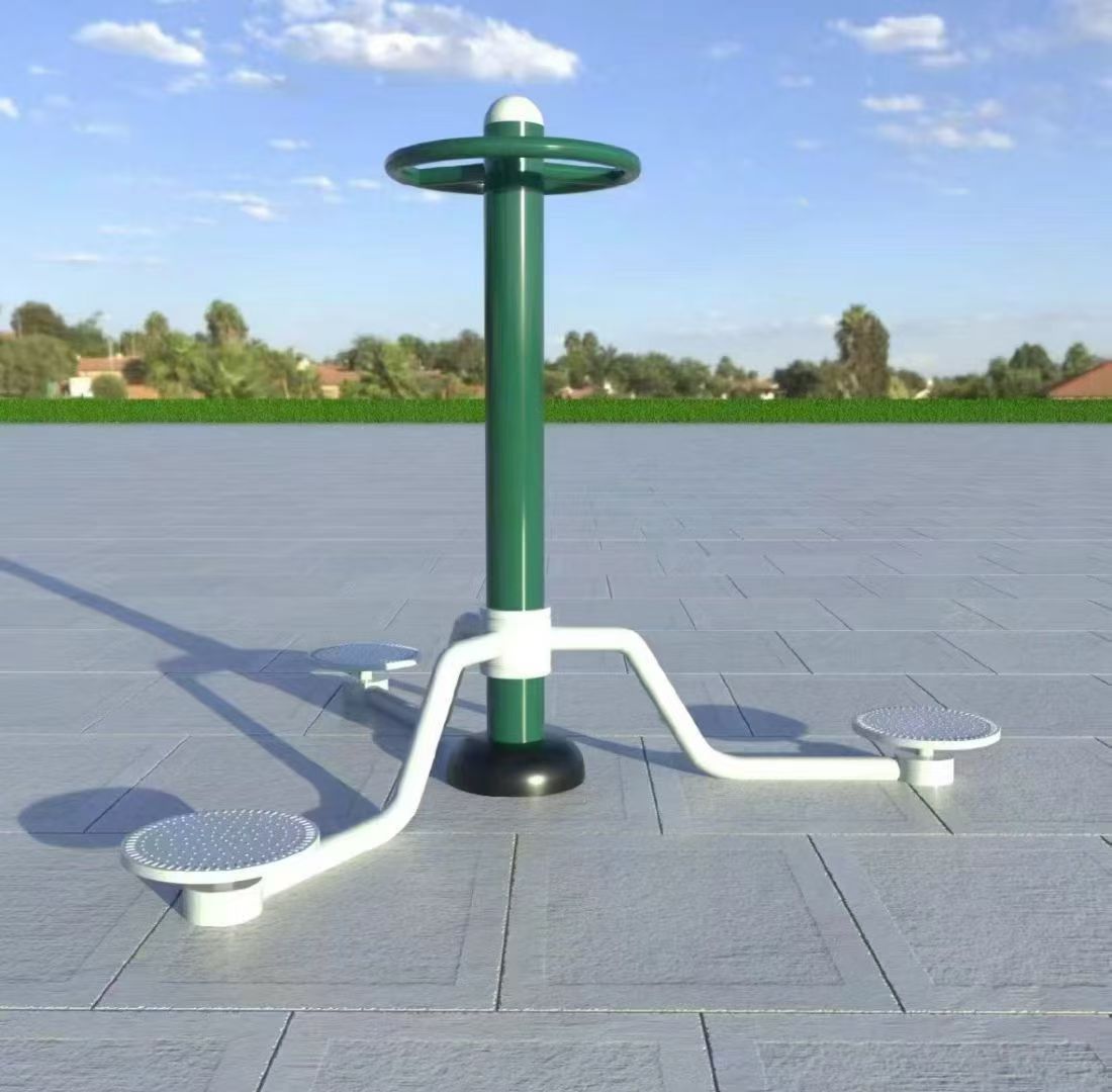 產品詳細介紹三人扭腰器 產品功能 三人扭腰器是一款針對腰部鍛煉的戶外健身器材,可同時供三人同步鍛煉,核心功能是鍛煉腰部肌肉、增強腰部靈活性與柔韌性,緩解腰部疲勞。通過雙腳站立于轉盤上,雙手握住扶手,左右扭動腰部,可有效鍛煉腰部腹斜肌、腰背部肌肉,促進腰部血液循環,緩解長期久坐、彎腰帶來的腰部僵硬、酸痛,改善腰部關節活動度,同時可提升身體協調性與平衡感。適合各年齡段人群使用,尤其適合中老年人群、辦公室人群緩解腰部疲勞,三人同步鍛煉可增進互動,提升健身趣味性,是戶外健身區使用率極高的器材之一。 結構與材質 1. 主體框架采用加厚國標鋼管焊接成型,結構穩固,承重性能優異,可同時承受三人重量,焊接處牢固,不易開裂、變形。 2. 表面經拋丸除銹+靜電噴塑雙重工藝處理,涂層均勻致密,抗腐蝕、抗老化、防曬、防雨,可適應戶外長期日曬雨淋、潮濕多塵等環境,不易褪色、生銹,延長使用壽命。 3. 轉盤采用優質工程塑料,表面設有防滑紋路,增大摩擦力,避免站立時打滑;轉盤連接精密軸承,轉動順滑,無卡頓、無噪音,可靈活左右扭動。 4. 扶手采用圓管設計,表面光滑,握持舒適,高度符合人體工學,鍛煉時可輔助保持平衡,降低摔倒風險;扶手與主體框架連接牢固,不易松動。 安全設計 1. 轉盤設有限位裝置,嚴格控制扭動角度,防止扭動幅度過大造成腰部拉傷、摔倒等意外情況發生。 2. 整機所有邊角、焊接點均經過精細打磨,圓滑無毛刺,杜絕尖銳部位劃傷、磕碰。 3. 采用地埋式固定,底座穩固,鍛煉時無晃動、不側翻,確保三人同時使用時的安全性。 4. 轉盤與軸承連接牢固,經過耐磨測試,可長期使用,不易損壞、脫落。 適用場景 小區健身廣場、市政公園、社區活動中心、鄉村健身點、企事業單位戶外健身區、養老院等公共戶外場所。 |
