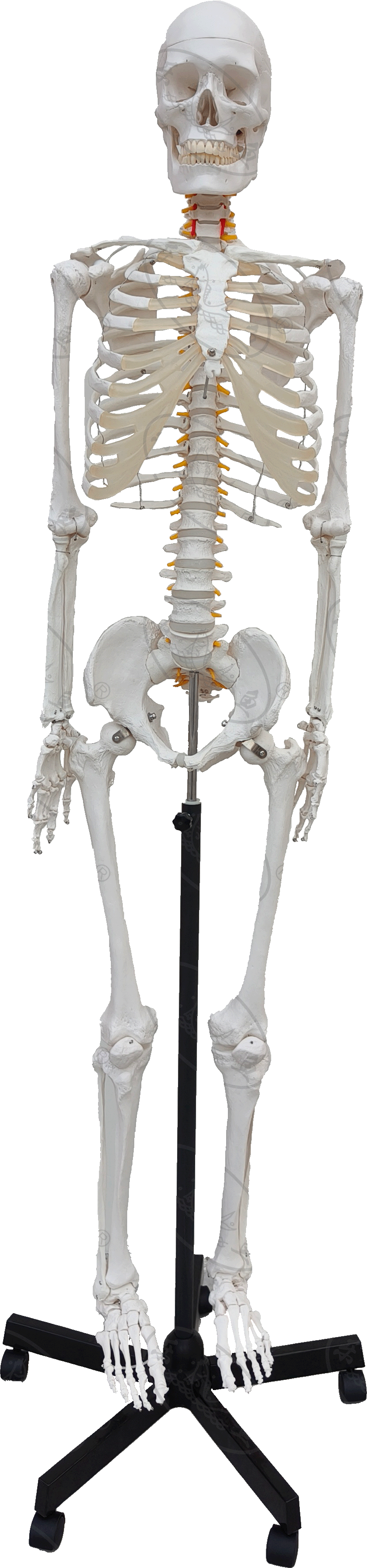 形態和結構:示成人骨骼,由全身散骨串制而成一整體骨架,成直立姿勢,四肢大的關節部分均可活動,顯示全身骨骼的組成和椎間盤等結構形態外觀、整體固定在支架上,帶底座,可靈活移動。