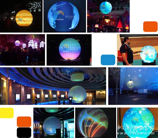 球形顯示產品無論是大型活動的演出還是形象宣傳,它的展示效果都能給人以全新的精神享受,管理者可以通過計算機操作,不斷更換播放內容,如廣告、動畫、比賽精選節目等,并能與活動主題相配合(比如大型活動演出,可以為這個演出制定專業的播放內容,任何一個活動可以由此進行配合造勢)。球形顯示作為特殊的光電展品,具有極強的視覺沖擊力和形象震撼力,廣泛的應用于科普教育、展覽展示、廣告娛樂及虛擬仿真等領域。
