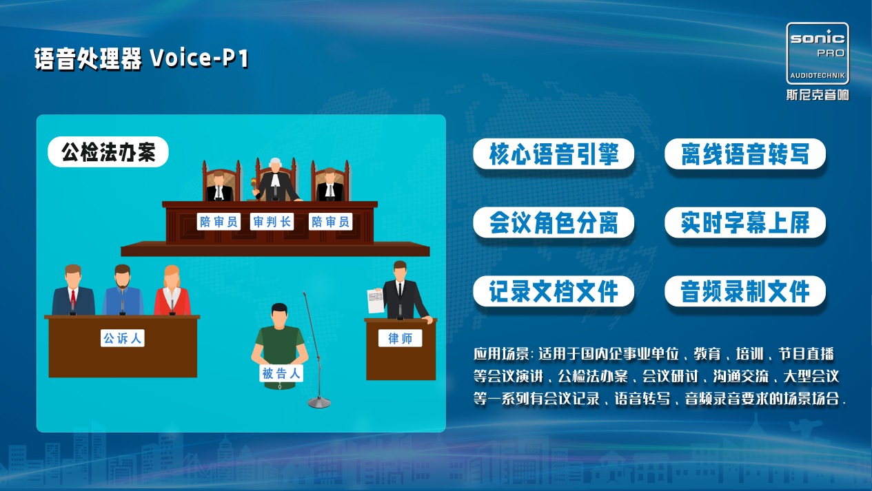 SONIC PRO斯尼克音響植入業內龍頭核心語音引擎,結合我們多年多會議場合應用經驗專門開發一款軟硬件結合,實現實時語音轉寫、會議記錄、音頻錄音的綜合語音處理器,該款語音處理器采用離線私有化部署運用核心語音識別轉寫技術語音清晰標準中文普通話轉寫準確率高達97%,同時支持英文轉寫,英文轉寫準確率達93%,在斯尼克語音處理器的應用下的會議場合,能幫助用戶解決會議過程中現場擴聲語音以及播放的音頻文件實時轉寫成文字,并能形成跑馬字幕上屏,輔助會議記錄人員進行會議紀要的整理與校正,系統提供的語氣詞過濾、自動分段等功能自動優化文字結果實現快速成稿。特別適用于國內企事業單位、公檢法辦案、教育、培訓、節目直播等會議演講、會議研討、溝通交流、大型會議等一系列有會議記錄、語音轉寫、音頻錄音要求的場景場合。