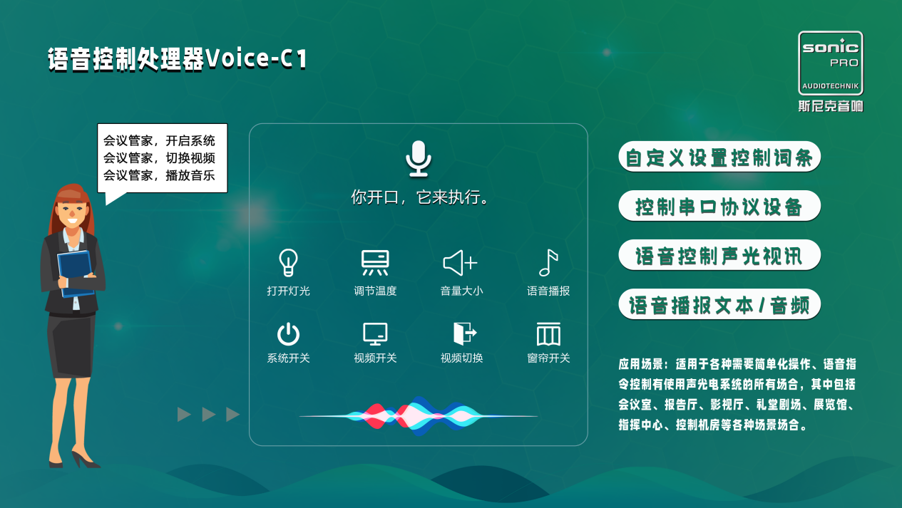 SONIC PRO斯尼克音響植入業內龍頭核心語音引擎,結合我們多年多會議場合應用經驗專門開發一款軟硬件結合,實時離線版語音控制處理器,該款語音控制處理器采用離線私有化部署運用核心語音識別技術,實現AI人工智能人機對話,讓機器聽懂人類語言,并通過人機交互,使機器按照人類思維指令實現對需要控制的設備進性非接觸式控制,在斯尼克語音控制處理器的應用下,能幫助用戶解決復雜音響系統實際控制與操作。語音控制處理器與SONIC PRO斯尼克音響中所有支持控制的數字化設備,適用于各種需要簡單化操作、語音指令控制有使用聲光電系統的所有場合,其中包括會議室、報告廳、影視廳、禮堂劇場、展覽館、指揮中心、控制機房等各種場景場合。