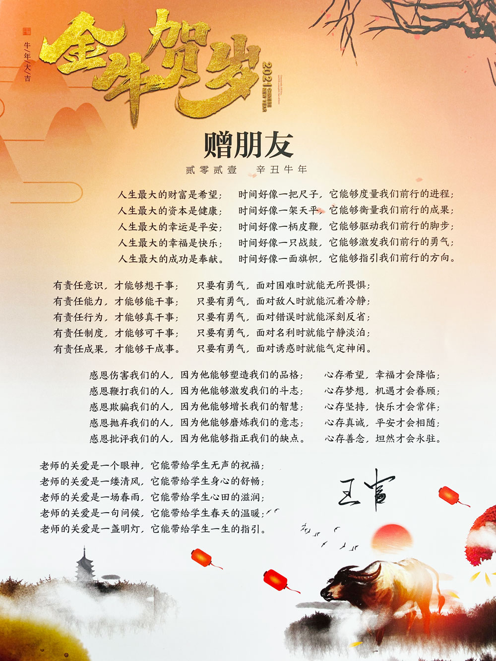 律回春漸,新元肇始。在這辭舊迎新的美好時刻,我謹代表中國教育裝備行業協會,向長期關心、支持教育裝備工作的各級領導、各界友人,向敬業愛崗、努力奮斗的教育裝備戰線全體同仁,向協會全體會員,表示衷心的感謝和誠摯的祝福,祝大家在新的一年里身體健康、工作順利、闔家幸福、萬事如意!