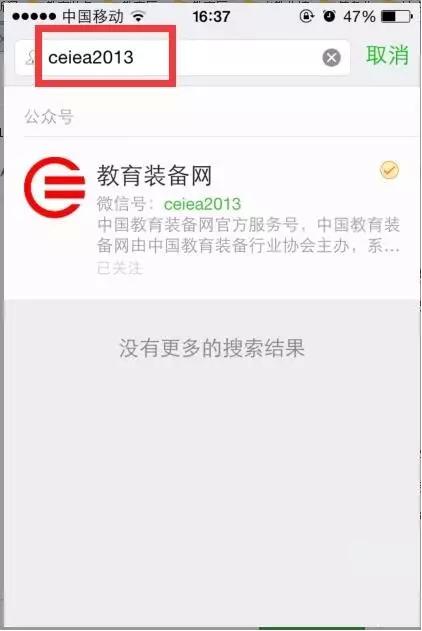 1、關注教育裝備網(wǎng)官方微信公眾服務號“教育裝備網(wǎng)(微信號:ceiea2013)”。
