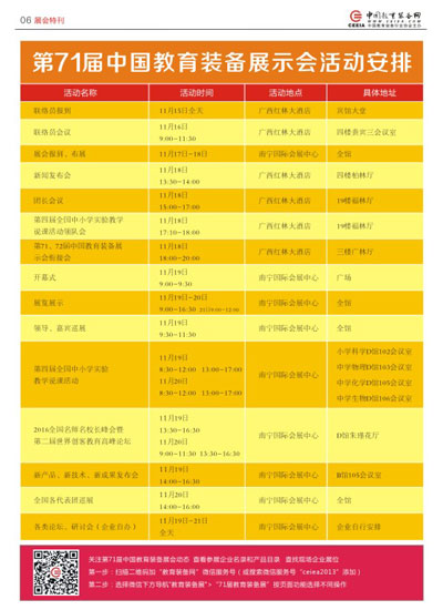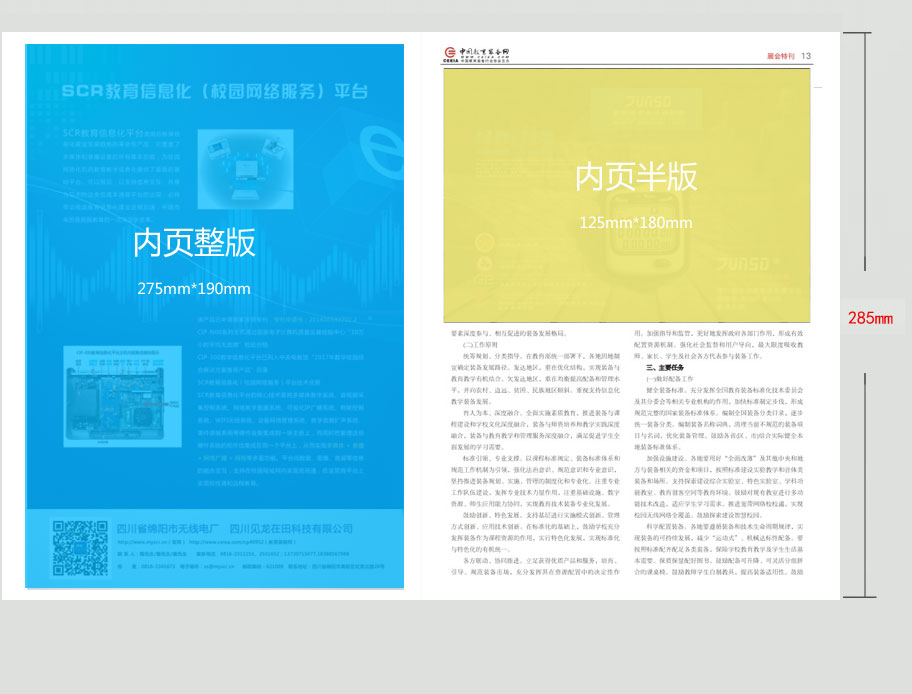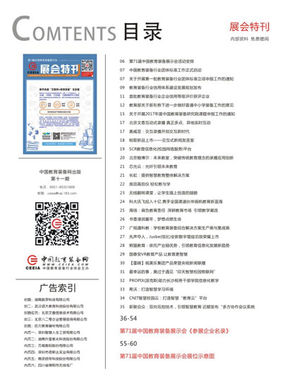 為更好的服務展會、服務企業、服務觀眾,教育裝備網圍繞“提供展會活動指引,突出參展企業亮點”為宗旨,精心策劃制作了《中國教育裝備展示會展會特刊》(以下簡稱《展會特刊》)!墩箷乜肥侵袊逃b備展示會期間集服務、宣傳于一體的官方刊物,內容涵蓋展會日程安排、行業資訊、場館地圖、優秀企業文章等。內容豐富、實用性強,展會期間,將免費發放給各省參會領導、代表、參展商以及現場觀眾。