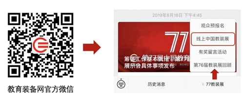 關(guān)注“中國(guó)教育裝備網(wǎng)”官方微信,從菜單欄找到“線上中國(guó)教裝展”,即可使用。