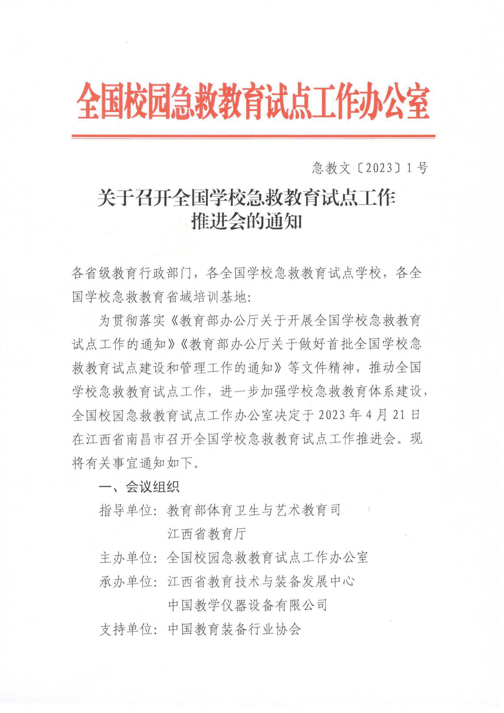 為貫徹落實(shí)《教育部辦公廳關(guān)于開展全國(guó)學(xué)校急救教育試點(diǎn)工作的通知》《教育部辦公廳關(guān)于做好首批全國(guó)學(xué)校急救教育試點(diǎn)建設(shè)和管理工作的通知》等文件精神,推動(dòng)全國(guó)學(xué)校急救教育試點(diǎn)工作,進(jìn)一步加強(qiáng)學(xué)校急救教育體系建設(shè),全國(guó)校園急救教育試點(diǎn)工作辦公室決定于2023年4月21日在江西省南昌市召開全國(guó)學(xué)校急救教育試點(diǎn)工作推進(jìn)會(huì)。現(xiàn)將有關(guān)事宜通知如下。