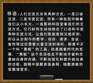借助現(xiàn)代科學(xué)技術(shù)的發(fā)展,特別是投影成像類的產(chǎn)品出現(xiàn),黑板也從簡單的文字書寫演變到具有圖片顯現(xiàn)的功能,并且可以整合音響話筒之類配套產(chǎn)品,圖文結(jié)合聲情并茂成為黑板發(fā)展史上一次質(zhì)的飛躍,比如我們現(xiàn)在常見的亞光投影白板、電動投影白板、投影幕布、復(fù)印式電子白板、電子顯示屏、熒光黑板等。