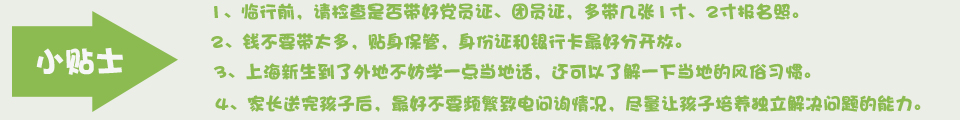 北京大學物理系大三學生陳瀟回憶起自己的新生報到日:從各種各樣的洗漱用品到磚塊兒似的工具字典,從被褥到臉盆衣架,吃的用的一應俱全,但后來他卻有些后悔了。“其實有的東西到了那邊再買也不遲,比如熱水瓶、臉盆、洗漱用品等既不方便攜帶、又能在超市買到的日用品就不必買好帶去。而工具書其實也不用全部帶過去,學校里買一本或者圖書館借閱都可以。”詳細>>> |